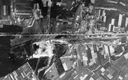 An aerial view of the Belzec area taken by the Luftwaffe during the war, which shows the camp and the rail lines leading to it. Circa 1944. Photo Credit: United States Holocaust Memorial Museum, courtesy of National Archives and Records Administration, College Park