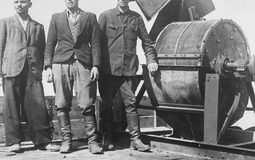 Jewish prisoners forced to work for a Sonderkommando 1005 unit pose next to a bone crushing machine in the Janowska concentration camp in Lvov, Poland. Circa Aug 1944. Photo Credit: United States Holocaust Memorial Museum, courtesy of Belarusian State Archive of Documentary Film and Photography